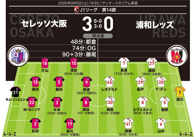 J1採点 寸評 C大阪3 0浦和 2得点を演出したドリブラーを文句なしのmomに 今季初弾ストライカーの評価は サッカー スポーツブル スポブル